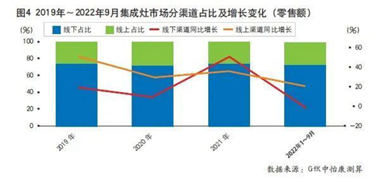 目前集成灶以线下市场销售为主,线上市场销售占比逐年提升。大品牌陆续进入电商平台,加之疫情爆发,进一步促进了线上市场快速发展。GfK中怡康测算数据显示,2022年1~9月,集成灶线下市场销售额占比为73.4%,相比2021年同比下降4个百分点;线上市场销售额占比为26.6%,相比2021年同比提升了4个百分点(见图4)。随着社交电商的崛起,GfK中怡康判断,集成灶线上市场占比还会继续提升。