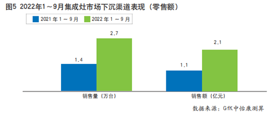 集成灶市场竞争进入白热化,寻求新的市场增长点成为当务之急,下沉市场的高速增长及广阔的发展前景吸引集成灶企业积极布局。目前市场呈现两种下沉方式:一是跟随电商平台或者苏宁等连锁卖场进行渠道下沉;二是企业自建渠道,将重心转向乡镇和农村市场。2022年1~9月,集成灶下沉市场销量达到2.7万台,同比增速为91.5%;销售额达到2.1亿元,同比增速高达97.7%(见图5)。