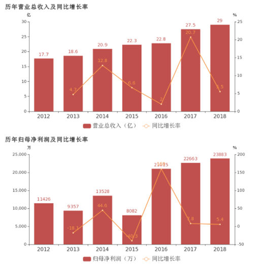惠达卫浴于2019年4月25日披露年报,公司2018年实现营业总收入29亿,同比增长5.5%;实现归属于母公司所有者的净利润2.4亿,同比增长5.4%;每股收益为0.65元。报告期内,公司毛利率为28.4%,较上年提高0.5个百分点,净利率为8.9%,基本维持上年水平。