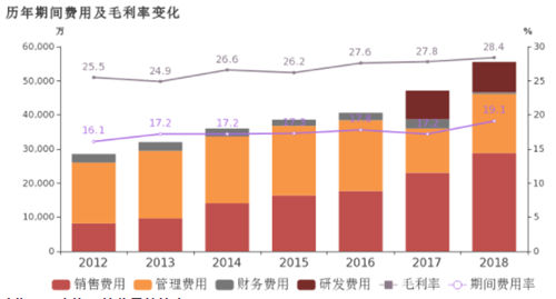 公司2018年期间费用率为19.1%,较上年升高2%,对公司业绩有所拖累。期间费用合计达5.6亿,同比上升17.8%。其中销售费用为2.9亿,同比上升25.2%;管理费用为1.7亿,同比上升33.1%;财务费用为483.1万,同比下降82%;研发费用为8882.5万,同比上升5.5%。营业成本20.8亿,同比增长4.7%,低于营业收入5.5%的增速,导致毛利率上升0.5%。经营性现金流由2.6亿下降至-5823.7万,同比下降122.1%。公司本期研发投入为8882.5万,同比上升5.4%。