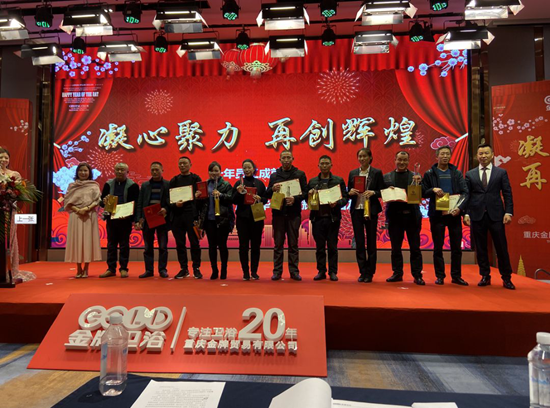 2020年1月8日,重庆金牌卫浴2020年团拜会如期在重庆沙坪坝丽苑大酒店隆重举行,公司所有员工欢聚一堂,共襄盛会。除了有丰盛的美食、精彩的节目、丰厚的奖品......多的是,家人们为此次年会准备的种种意想不到的惊喜..........