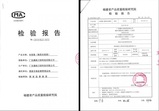 本次国家监督抽查检验(也称国检)是行业最高标准、最严格的检查检验,是国家市场监督管理总局根据:GB/T 6952-2015《卫生陶瓷》、GB 25502-2017《坐便器水效限定值及水效等级》及 GB/T 26730-2011《卫生洁具 便器用重力式冲水装置及洁具机架》等检验依据;《2019年陶瓷坐便器产品质量国家监督抽检方案》判断依据。在随机抽检的连体坐便器(陶瓷坐便器)型号KN1418-3,判定为抽查产品完全合格。