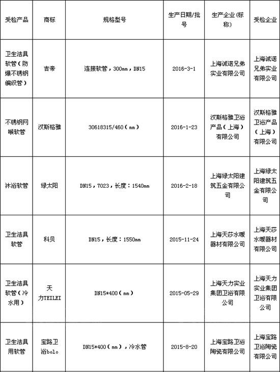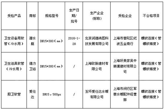 抽查发现有3批次产品不合格,包括(标称)北京润德鸿图科技发展有限公司生产的1批次潜水艇卫生设备用软管(冷水用)(规格型号:DN15*300(mm);生产日期/批号:2016-1-28)、(标称)上海欧脉建材有限公司生产的1批次德力卫浴卫生洁具软管(冷水用)(规格型号:DN15*300(mm))、(标称)玉环爱仕达水暖有限公司生产的1批次爱仕达厨卫软管(规格型号:DN15,500px),涉及的不合格项目均为“螺纹连接(管螺纹精度)”。