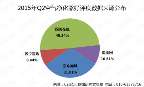 2015年第二季度空气净化器行业监测主要品牌的产品好评度的数据主要来自于淘宝网、京东商城、国美在线、苏宁易购四大电商平台。其中,好评度近半数分布在国美在线,占总体的49.34%;其次是京东商城,占比31.61%;苏宁易购分布最少,占8.44%。