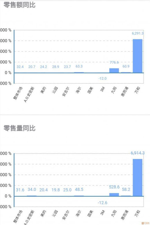 零售量方面,Top10品牌中,依旧为3M处于下行状态,同比下降了12.6%。而增长强势品牌依旧为万和和九阳,涨幅分别达到了6914.3%和528.6%。