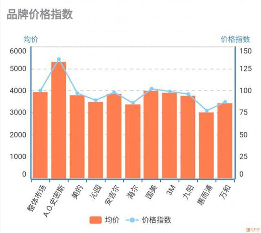 价格方面,可以看到目前净水器市场整体价格较高,整体市场均价接近4000元。Top10品牌中,均价最低的惠而浦也在3000元左右,而A.O.史密斯均价最高,已经高于5000元。可以看到,目前净水器市场产品价格较高,未来品牌进行高端化升级道路或许更加通顺。