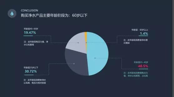 参与调查者年龄分布:25~40岁占比接近5成。25~40岁消费群体是社会的中流砥柱,是消费净水器产品的主要人群。值得关注的是,“90后”新生代对净水认知度也非常高,成为净水产品消费的潜在消费群体。