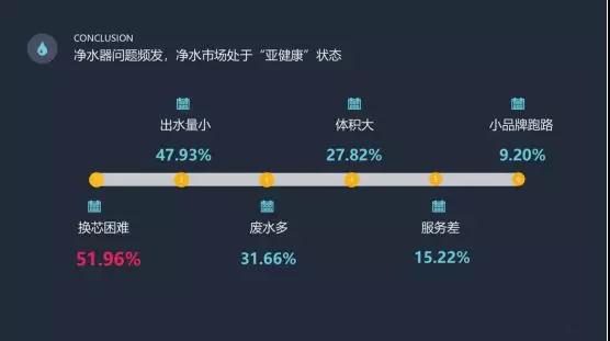 您在使用过程中,净水器的主要问题有哪些?过半消费者都面临“换芯困难”“出水量小”“废水多”等问题也比较突出。事实证明,净水器是产品+服务的统一体,没有服务的净水器并非一个完整的产品。