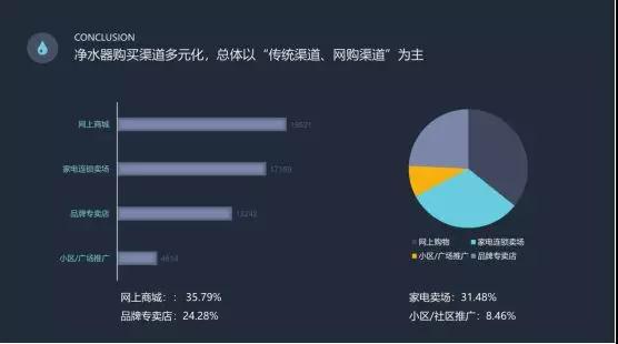 您通过哪种渠道购买的净水器?调查结果显示,净水器购买渠道呈现多元化,网上购物占比较高,家电连锁卖场处于第二位;品牌专卖店处于第三位。而小区推广渠道较少,显示出消费者在购买净水器产品时日渐趋于理性。