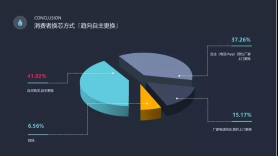 你家更换滤芯的方式是怎样的?消费者自主更换和厂家上门更换比重基本相同。一方面,消费者自己更换滤芯是厂家降低售后成本的一个办法;另一方面,很大一部分厂家无力提供及时、贴心的售后服务,很大程度上影响了净水器的消费体验。