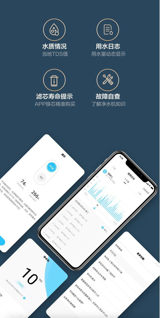 除此之外,美的白泽1000净水机还能通过手机WiFi智联实现远程查看水质和监控机器使用状况,而且滤芯的使用寿命及机器用水动态也能一目了然,还能实现一键购买滤芯等功能,饮水生活尽在掌握。