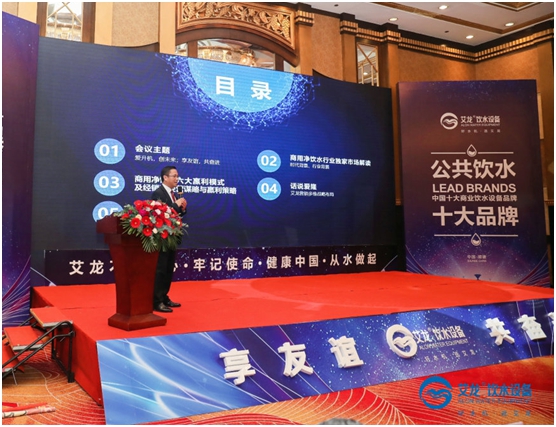 大会上,艾龙总经理傅永旺先生率先登台,代表艾龙全体人员再次向应邀前来的经销商家人们致以崇高的敬意。随后,傅总围绕“商用净饮水行业独家市场解读”、“多维度战略布局”、“经销商经营谋略与赢利策略”三大核心主题进行重要讲话。