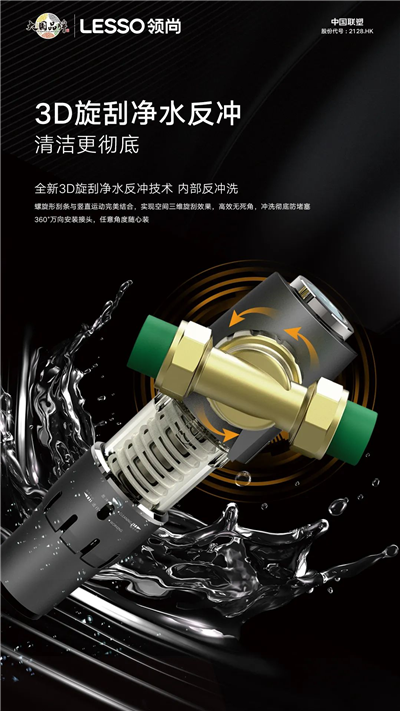 前置过滤器的冲洗方式大多为直冲和反冲两种。直冲型在冲洗时,会用含有杂质的自来水从上往下冲洗,这样杂质容易积留在滤网表层,而反冲型可以用上层过滤后的水进行反冲,清洁更加彻底。领尚前置过滤器706Q(升级款),360°万向安装接头,任意角度随心装,3D旋刮净水反冲,清洁无死角。