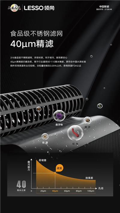 另外,过滤精度太小会影响水量,造成家里用水不方便,过滤精度太大的话,起不到过滤的效果,一般过滤器的过滤精度在40-100微米。领尚前置过滤器706Q(升级款)采用食品级不锈钢滤网,40微米精滤,有效拦截泥沙、铁锈、胶质、虫卵,安全耐用更安心。