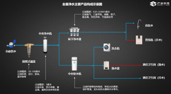 全屋净水系统主要由前置过滤器、中央净水机、厨下净水器和软水机、管线机等产品组成。其中,前置过滤器负责的是第一道防线,过滤精度约为50-100微米,主要过滤水中的泥沙、胶体、悬浮物等。然后进入中央净水机再进行第二道过滤,过滤精度约为5微米,过滤余氯、重金属、有机物及部分细菌。