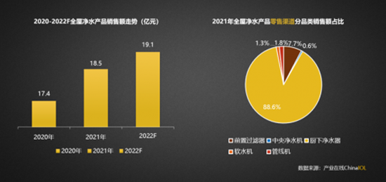 在全屋净水产品的销售过程中,用户既可以选择全套整体购买安装,也可以单独产品购买。由此导致其出货渠道也比较复杂,包括工程渠道(如精装修)、零售渠道(线上/线下)等多种。据产业在线调研数据,2021年全屋净水产品销售额大约在18.5亿元左右,同比增长6.3%。相较于整体净水产品的下滑,呈现逆势增长态势。
