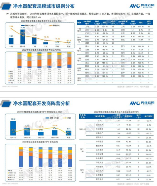 产品规模分析: 2022年净水器市场受房地产下行影响,配套规模近乎腰斩式下滑。据奥维云网(AVC)监测数据显示,2022年精装修市场配套规模为34.26万套,同比下降44.1%,但净水器配置率始终保持连年趋缓上升趋势,2022年净水器配置率达23.5%,同比去年上升2.1个百分点。