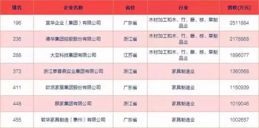 【据500榜单显示,本次制造业500强中与家具行业相关的企业有7家。】