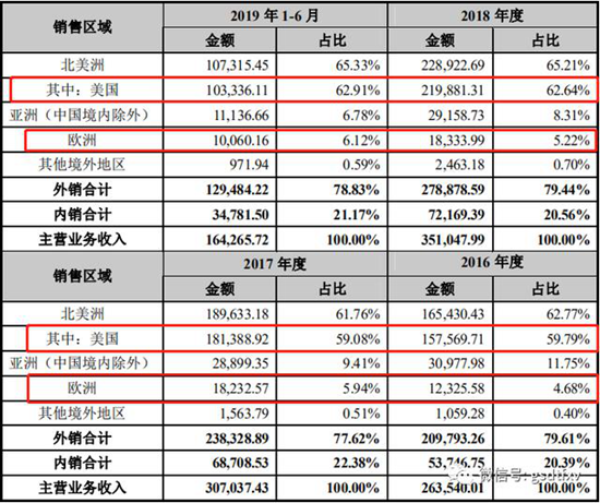 按照地域划分,建霖家居业务以外销为主,2016-2018年、2019年上半年,公司外销收入分别达20.98亿元、23.83亿元、27.89亿元和12.95亿元,占主营业务收入的79.61%、77.62%、79.44%和78.83%。其中,公司外销区域又集中在美国,占比基本都在60%左右,且有越来越大的趋势。另外,欧洲的占比也从2016年的4.68%上升到2019年上半年的6.12%。