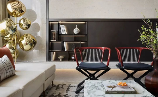 客厅内布局呈对称形式以增加生活互动感,家具形制以礼序进行陈设,让生活状态回归舒适与自然。东方文化意味的“水、山”装饰元素,致简表达了轻盈的美学诗意。