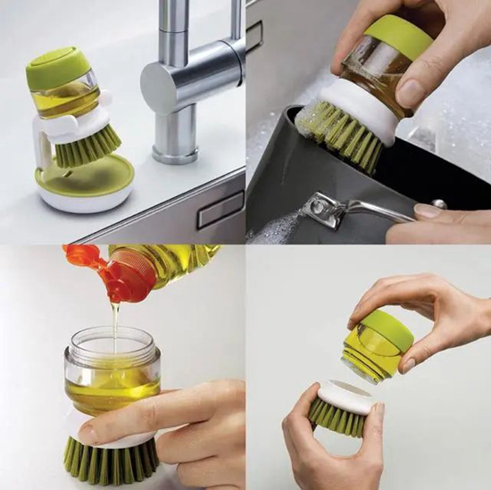 与普通的钢丝球、洗碗海绵相比,这款创意洗碗刷套装加入了储罐设计,在储罐中倒入洗洁精,提升了洗碗效率。轻压操作的设计,只需要轻按洗碗刷手柄底座,就可以轻松挤出洗洁精。下面的回流底座可以收集水渍,保持台面干爽。