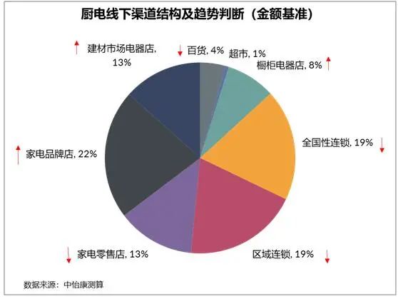 从数据上也可以明显看到传统家电渠道的地位在经受挑战。引用中怡康的相关研究结果,目前厨电品类在线下市场的渠道分布是以传统家电渠道和家居渠道为主,同时品牌专卖店也占据重要地位。具体来看,传统家电渠道代表——全国性连锁和区域连锁均为19%,此外百货和超市合计占5%;家居渠道代表——建材市场电器店和橱柜电器店占比分别为13%和8%;家电品牌店占比也不低,为22%。结合几个渠道近几年的发展趋势,我们看涨家电品牌店、橱柜电器店和建材市场电器店的未来走势,看跌其他渠道。显然,在当前市场需求萎靡不振的大形势下,对于家电厂商尤其是厨电厂商而言,前装渠道是破局关键所在。