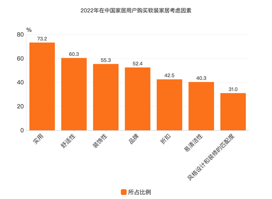 iiMedia Research(艾媒咨询)数据显示,73.2%的消费者购买软装家居时考虑实用性,其次是舒适性(60.3%)。