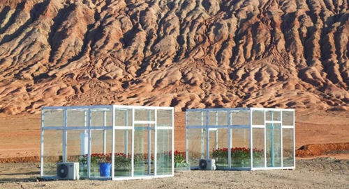 而为了能够更加直观的展现空调的制冷效果,奥克斯还在火焰山下临时搭建起的“玫瑰花房”里,将一株株鲜艳绽放的玫瑰花整齐的摆放在两个实验室内,同时也将部分玫瑰花放在实验室外的阴凉处作为对比验证。一时间,摆满玫瑰花的玻璃实验室,在寸草不生的戈壁滩上形成一道非常亮丽的风景线。