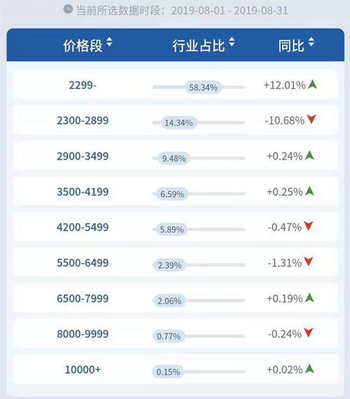 第一,价格仍是决定空调线上销量的主要因素之一。通过奥维云网数据显示,2019年8月线上市场均价来到了2678元同比去年下降5.6%。同时,在8月份2299元以下产品销量同比增长12.01%占总销量的58.34%。因此钉科技认为,线上市场之所以保持不错增长可能跟价格有关。