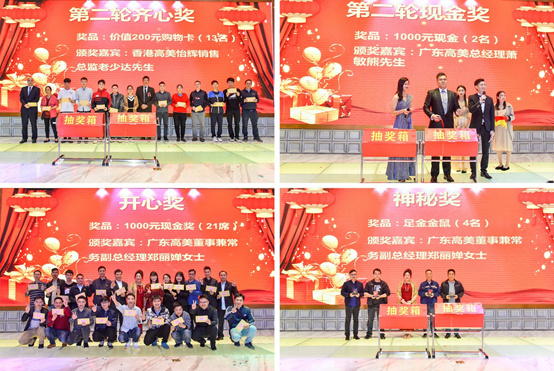 伴随着载歌载舞的欢乐氛围,高美全体家人共进晚宴,在欣赏歌舞表演之余,大会还举行着一轮轮精彩纷呈的抽奖活动。200元购物卡、500元和1000元现金奖、时尚无线蓝牙耳机、空气清新器、金鼠、笔记本电脑等厚重大礼陆续呈上,让家人们甚感暖心,兴奋之情溢于言表。