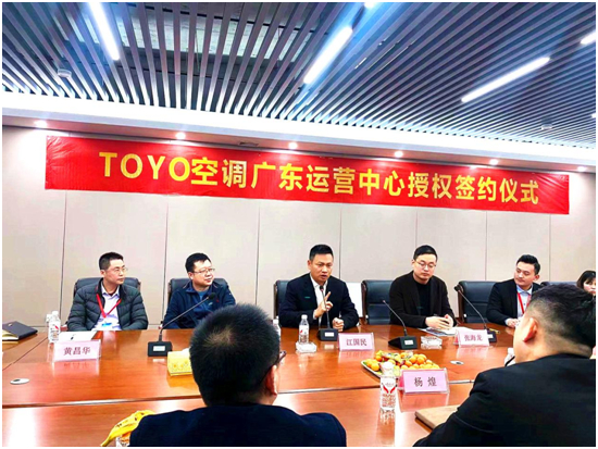 签约仪式上,广东幸福树电器销售有限公司执行董事长杨煌先生与TOYO东洋空调全国营销总经理张海龙先生作为双方企业代表进行合作签约,成立广东运营中心,目标年任务达成一亿销售规模。
