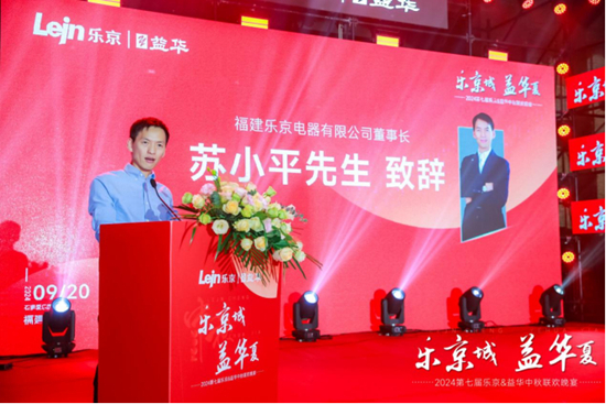 在吴总致辞结束后,福建乐京电器有限公司董事长苏小平走上舞台,向全体来宾致以诚挚的问候和祝福,并表达了对福建乐京未来发展的信心和期待。他强调,乐京空调以卓越品质和贴心服务获认可,离不开代理商的努力。今天的晚宴是对过去的肯定和未来的期许,交流经验,探讨未来发展之路,福建乐京将秉持高品质标准,创新服务模式,为消费者带来更好体验。