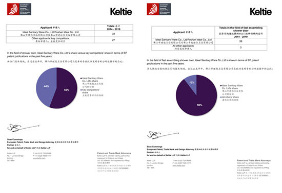 从研发上看,理想卫浴掌握淋浴房核心科技,研发创新一直走在世界前沿。目前,理想卫浴在欧美发达国家申报专利163项、获得国际发明专利26项,共获得国内外专利证书近300份。据欧洲Keltie LLP公布的最新报告,截至今年5月,在淋浴门专利技术领域,理想卫浴相对于其他主要竞争对手的专利占比为56%,雄据榜首;而在有关快速安装的淋浴门技术领域占比更是高达90%,遥遥领先同行。一系列耀眼的数据,为理想卫浴实力背书。
