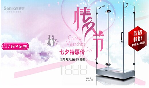 中国十大淋浴房品牌——圣莉亚官网公布2014年7月19日到8月10日将开展以“浴”见爱,遇见幸福“为主题的七夕促销活动。届时圣莉亚的爱琴海系列淋浴房将会以优惠价与大家见面。