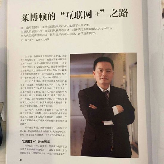 22年前,他从湖南株洲来到广东中山,开始进入淋浴房行业;14年前,他创立了莱博顿卫浴品牌;4年前,他开始筹划卫浴电商项目……这个一路在卫浴行业风雨前行的人,就是中山莱博顿卫浴有限公司总经理——段军会。 2014年,段军会带领着他的莱博顿,全年实现淋浴房销售42万套,销售额达到4.5亿,其中80%远销海外。