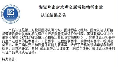 据最新消息,近日国建联信认证中心认证发布了《陶瓷片密封水嘴金属污染物析出量认证结果公告》,公告中写到“产品认证是第三方按照国际认可论坛、国际标准化组织、国家认证认可监督管理委员会发布的相关程序对产品质量实施评价的过程。国建联信认证中心依据《陶瓷片密封水嘴金属污染物析出量认证实施规则》,对申请企业相关产品生产过程中的技术要求、工艺要求、过程控制要求、阀体材料要求、检测设备要求、出厂确认要求和质量保证能力要求等,进行了严格的现场审核和抽样检测。经技术评定,共66 家企业符合认证要求,现准予注册。获证企业注册的认证产品详见认证证书。”