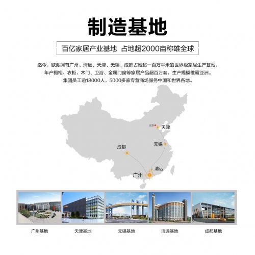 欧派家居集团拥有五大生产基地,20万平方米的全自动生产线,营销网络遍布全国,线下销售和服务门店超过 6000 家。