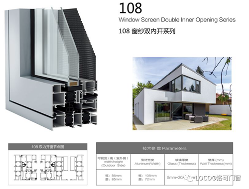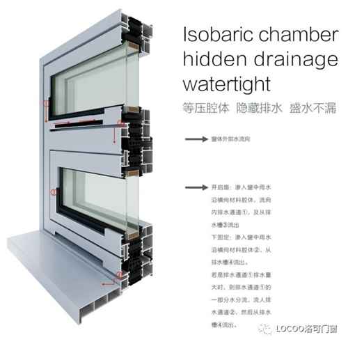 铝合金型材用双道隔热设计,并在隔热腔内填充聚氨酯,更在玻璃边缘布置PU海绵从而提高了窗体的保温性能和隔声性能,隐藏排水以疏水为设计原则的排水构造,结合等压排水的原理,使窗体排水更加顺畅。