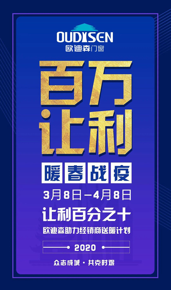 自2020年3月8日至2020年4月8日,欧迪森门窗向经销商让利百万,总部零利润补贴直供,分担经营压力,全系产品出厂价直降10%,共克时艰。