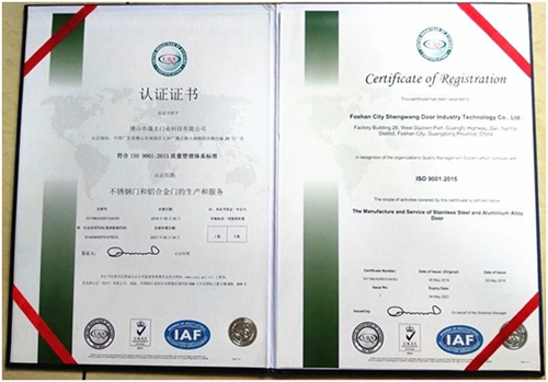 来自中国门窗六大生产基地之一——珠三角生产基地的佛山市晟王门业科技有限公司是一家专注研发生产不锈钢门和铝合金门窗的大型实力门窗企业,在历年的沉淀中形成了一套符合自身发展的系统体系。如今,晟王门窗经过不懈的努力,凭借着出色的生产实力及质量管理系统,顺利通过了“优克斯认证(杭州)有限公司ISO9001:2015质量管理体系标准”的审核和认证,并荣获由“优克斯认证(杭州)有限公司”颁发的“ISO9001:2015质量管理体系标准”的认证证书。