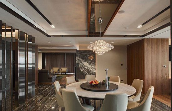 设计师认为“饮食”是生活中极为重要一环,因此选择餐厅作为中心,汇集所有动线,形成家人之间的互动交谊点。行云流水的木饰面板纹理,不但极有视觉张力,还与相邻空间的玻璃门片,相互串连衍生宽绰的场域气势。