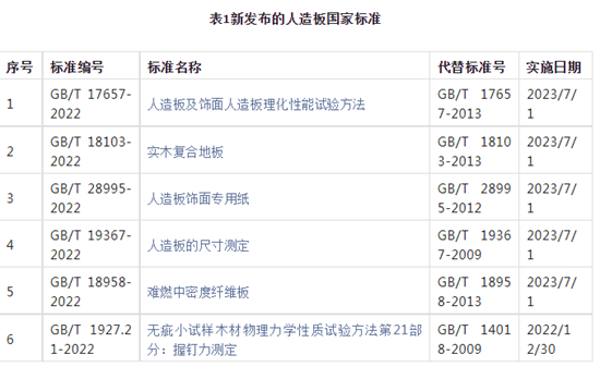 除国家标准《无疵小试样木材物理力学性质试验方法第21部分:握钉力测定》已推行实施外,其余新增人造板国标确定于2023年7月1日实施。