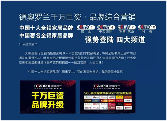 德奥罗兰:CCTV四大视频展播品牌、“中国十大全铝家居品牌”之一,积极响应《健康中国行动》国家重大战略,旗下的“铝创经典”为国人的健康家居生活谋安“醛”,通过打造全屋全铝家居制定,让万户千家拥有“健康安醛·绿色环保”的家居生活!