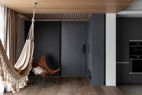 入户门与鞋柜颜色统一,增加空间延伸感。木质的格栅天花设计,为回家增添小小仪式感。黑板墙记录着生活的点点滴滴。