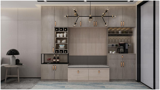 入门即是玄关,秋日晴风系列塑造了一个从工作到家空间转换的感觉。玄关柜满足储藏鞋子、衣物的功能,收纳柜上的摆件无形展现了精致感,简洁而不失轻奢感。