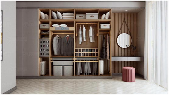 温润木纹与透亮玻璃双材质融合,是在工业时代下被骄纵的率性自然,布纹玻璃与银粉灰边框的结合,让衣柜拥有动静相宜的韵味,而干净利落的线条削去了生活冗杂的犄角。