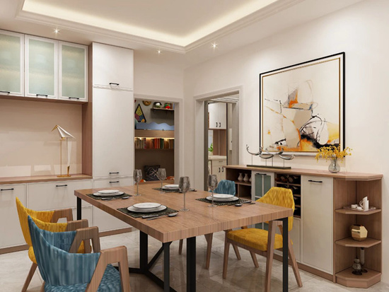 量身定制的餐边柜是亮点,银装白和金丝沉香让居室于简约中透露出轻奢的质感。柜体中央的开式挂墙系统巧妙地打造了一个微型酒柜,在智能感应呼吸灯的映衬下,极富现代感。柜内置入智能餐柜精灵,柜门采用“零度”肤感板,如同婴童肌肤般细腻丝滑,具有极哑、防指纹、不粘手、抗污、耐刮、可修复、环保无味、耐黄变8大特点,让居室表里如一,纯净如初。