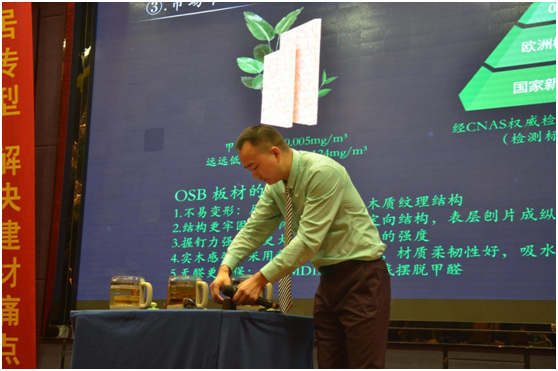 值得一提的是,营销总经理习士文先生在演讲过程中,为大家演示了行业中著名的水煮板材实验,通过对比密度板、颗粒板及鲁丽OSB板在水煮后呈现的物理性能和水的颜色向参会人员直观的展示了鲁丽OSB板强大的物理性能,许多参会人员在亲手感受到鲁丽OSB板的性能之后,纷纷竖起大拇指。