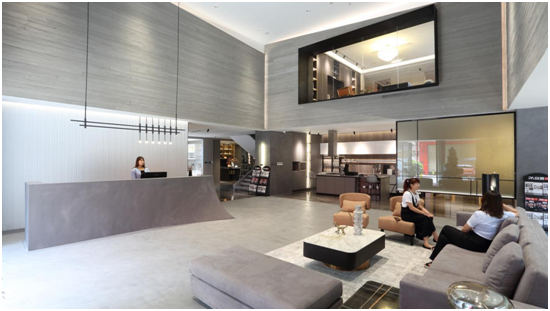 其中,营销中心产品展厅采用了现代轻奢极简风格设计,简约不凡、舒适实用,集产品展示与多功能会客厅为一体,为到访客户展示品牌全新产品及舒适的场景化参观体验。