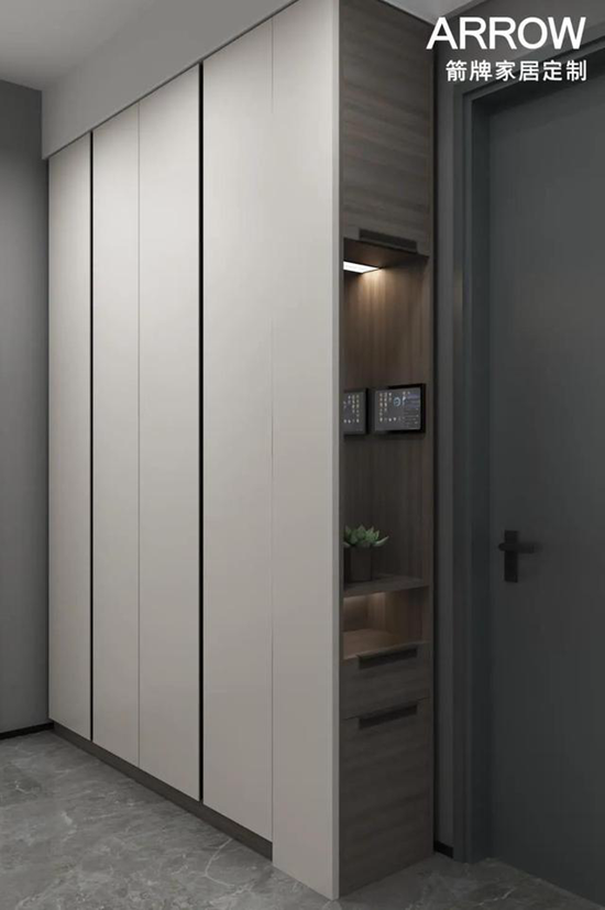 玄关入户,浅灰色皮纹和灰柚木碰撞交融,观之,静气敛神。25mm厚度门板一门到顶,卸下多余装饰,提亮空间感。柜体开放空间兼顾绿植展示柜和储鞋换鞋区,一进门,感受熟悉的味道和情感,回归独属的精神领地。